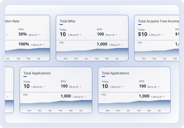 Track BINs acquired, retention rates, and fee income at a glance to guide portfolio strategy.
