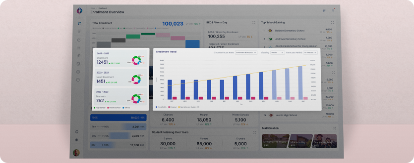 Transform K-12 and P-20 enrollment data into actionable district intelligence with forecasting, analytics, demand patterns, and utilization of insights.