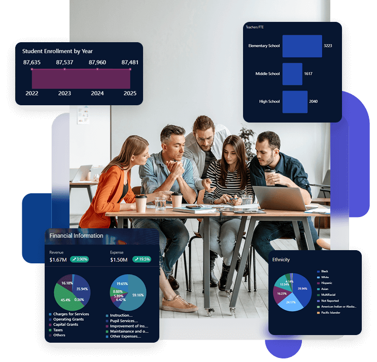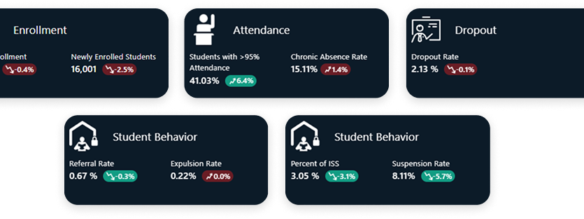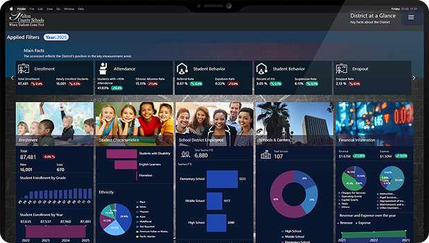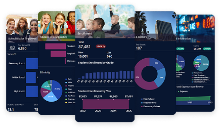 Bring academic, operational, financial, attendance, climate, and staffing insights into a single, executive-level dashboard.
