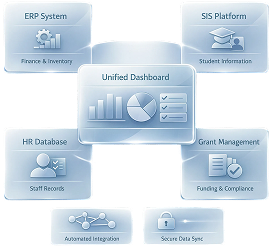 Connect ERP systems, SIS platforms, HR databases, and grant management tools into one unified view. Eliminate data silos and reduce manual reporting through automated, secure integrations built for K–12 environments.
