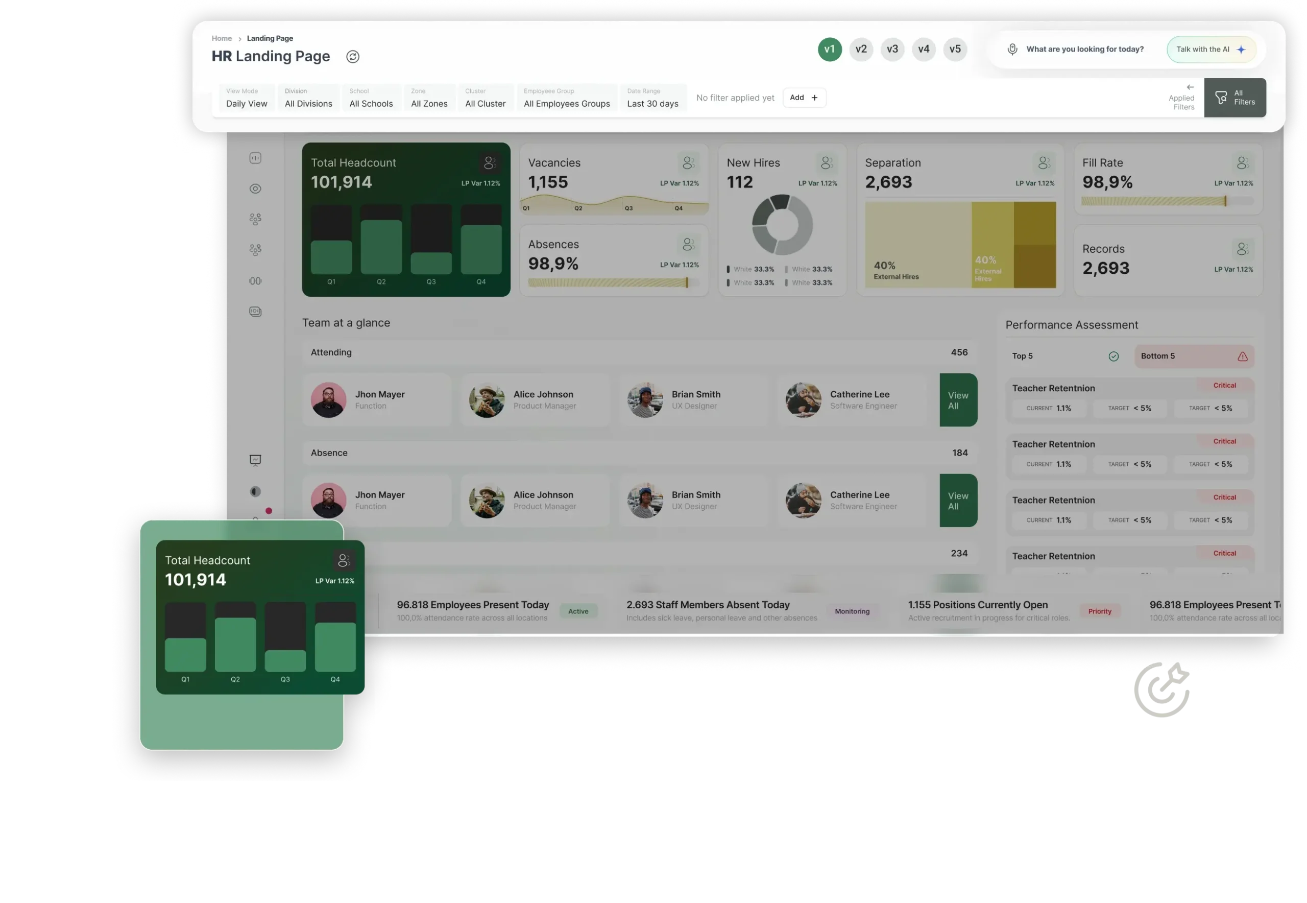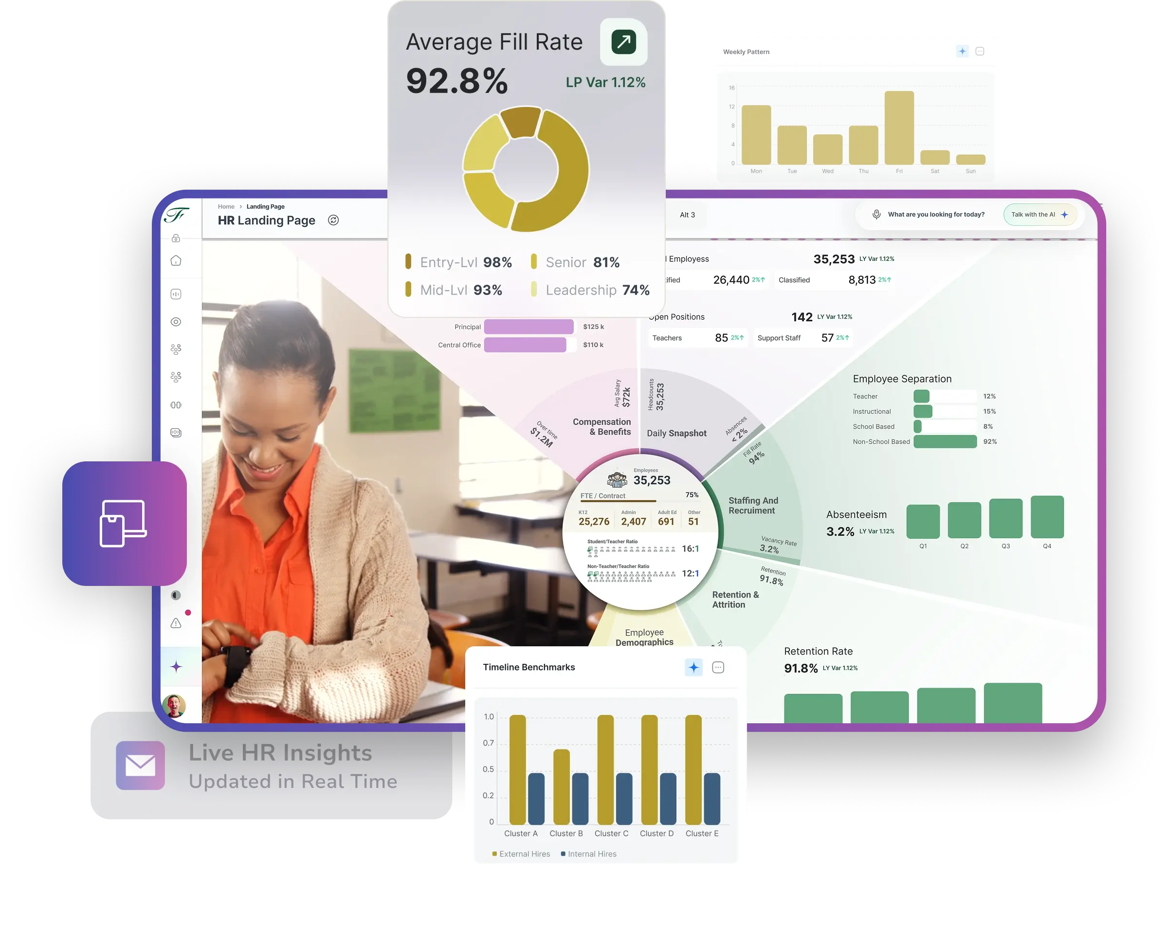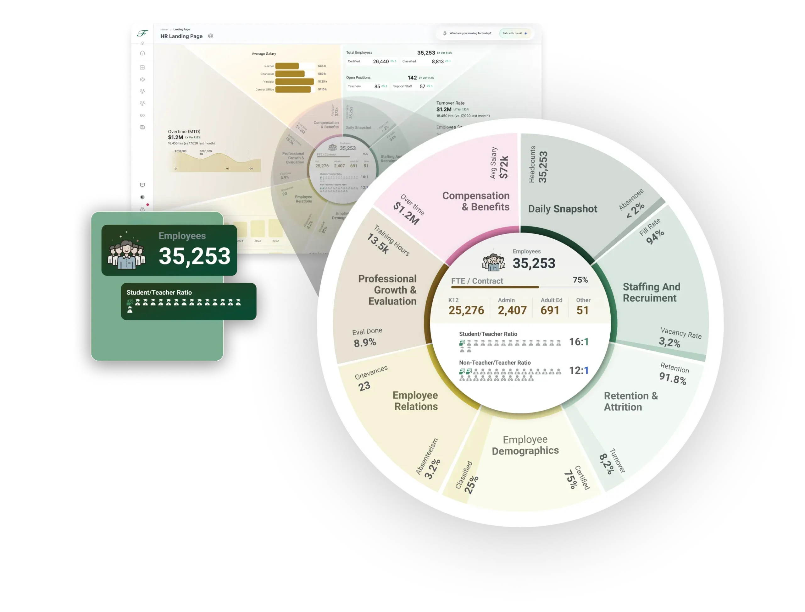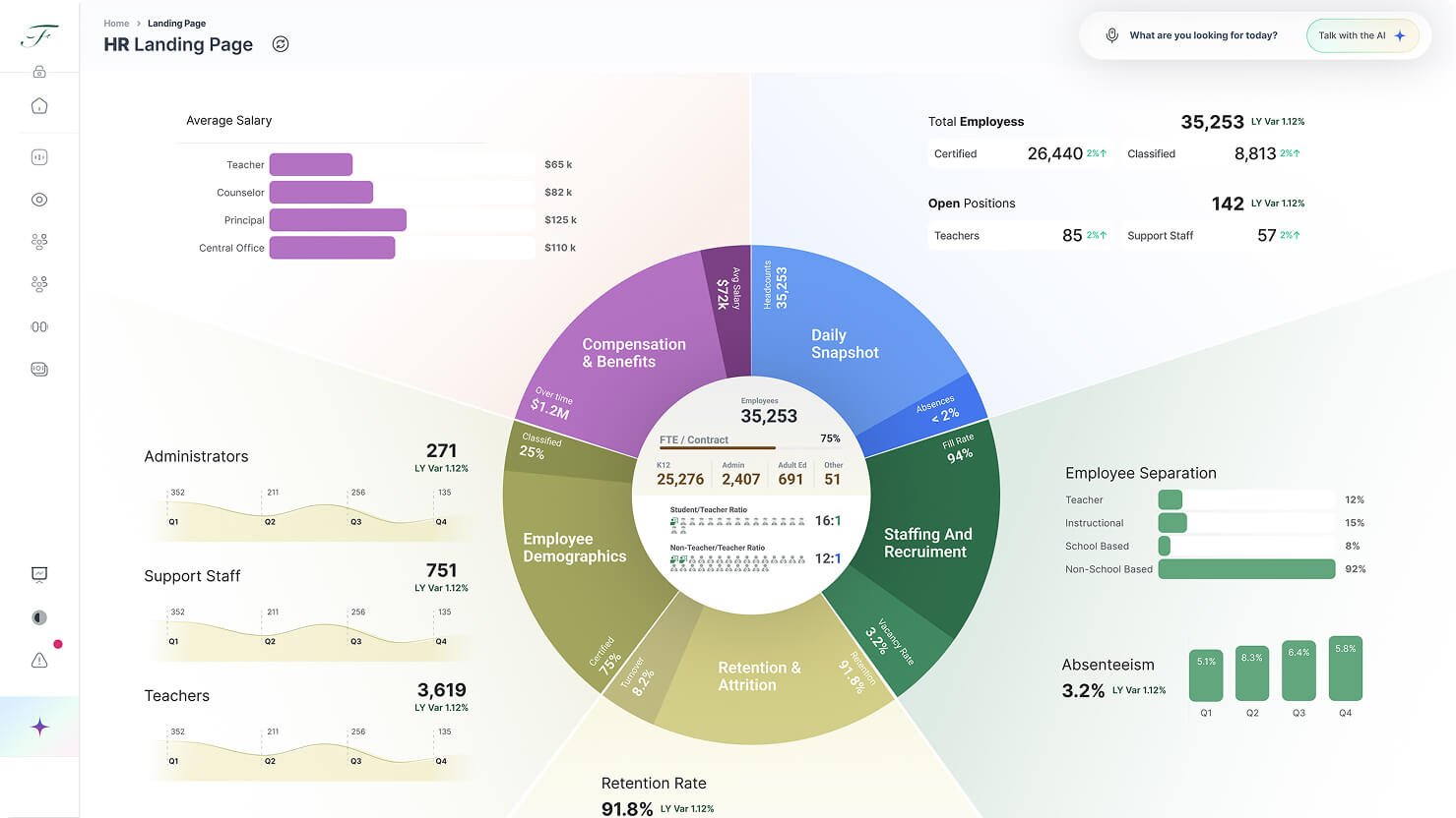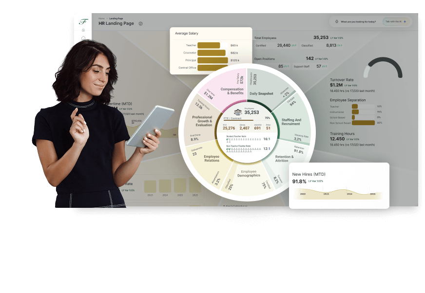 Transform how your district plans, hires, and retains staff. Our AI-powered K-12 HR dashboard delivers real-time insights into staffing, costs, and equity—enabling faster, data-driven workforce decisions with confidence.
