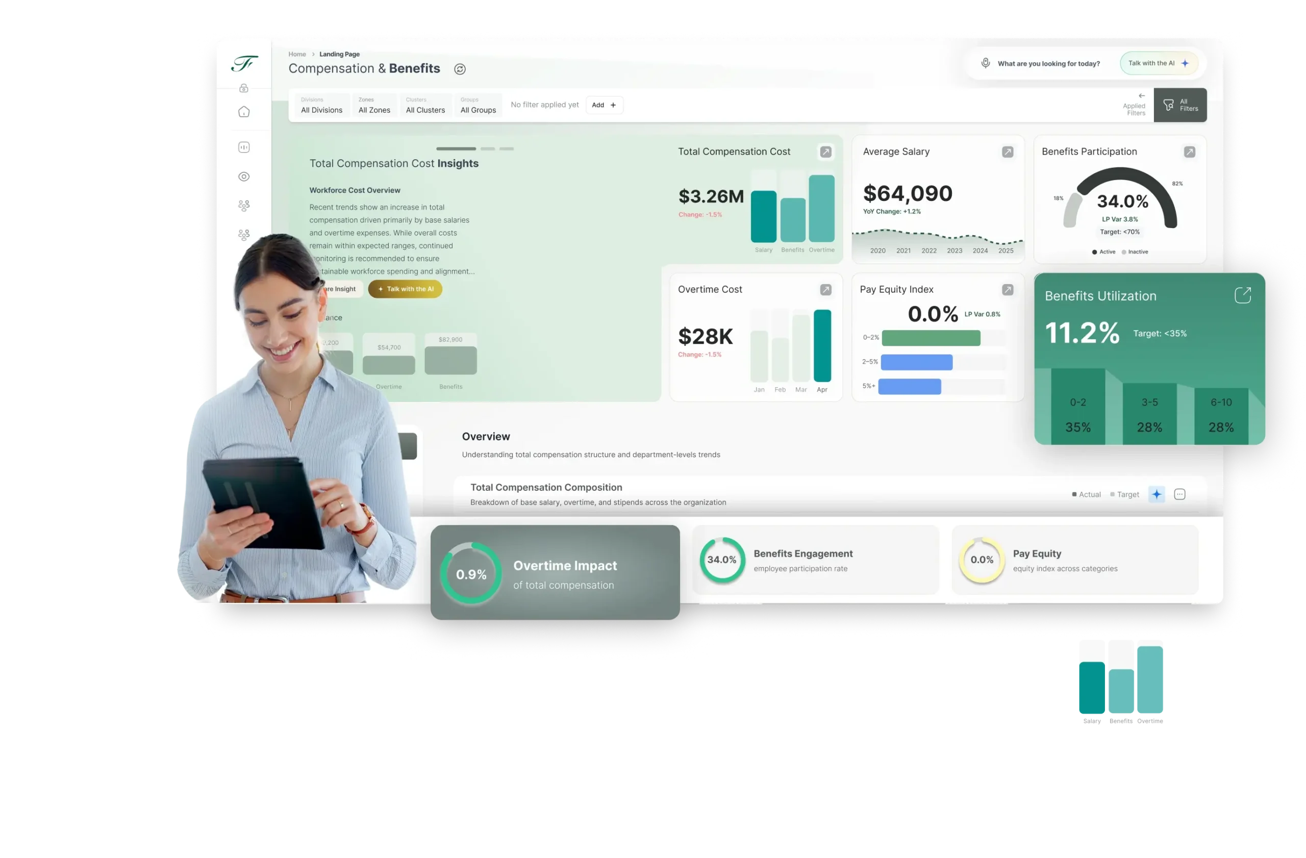 Visualize your workforce by experience, role, and demographic data. Ensure transparency and equity in hiring, retention, and resource allocation.
